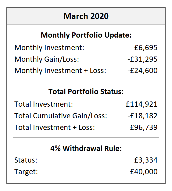 Whoa, what happened there?! Ouch, what a month. 2020 is turning out to be one crazy year, record stock market highs followed by one of the biggest stock market crashes since the great depression. Covid-19 has had a massive impact on the global economy with the majority of the world in lock-down, including us here in Germany. These are truly unprecedented times as the world struggles to contain the virus and as uncertainty of what happens next continues to build, the markets continue to drop. In just the past 3 weeks our portfolio has dropped in value by £31k and we are absolutely…